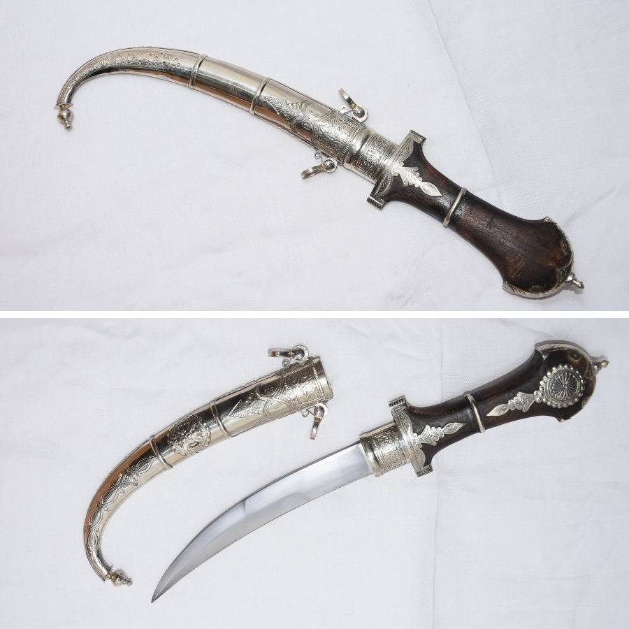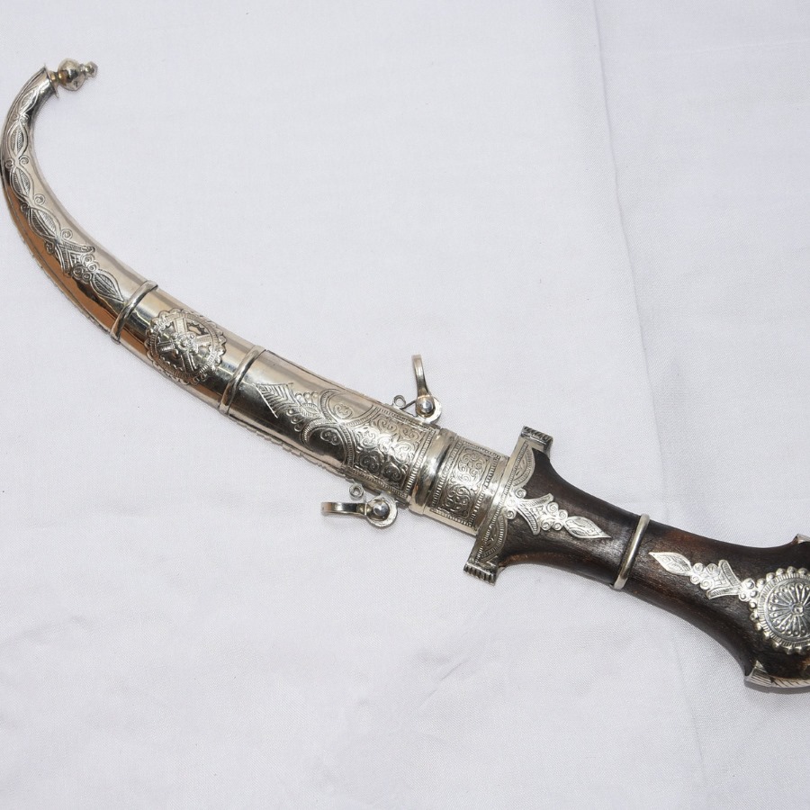 Moroccan Berber Dagger, Handcrafted by Artisans in Morocco, is very fine quality craftsmanship with a wooden grip engraved with Moroccan silver and chiseled in scrolling Moorish foliage.
